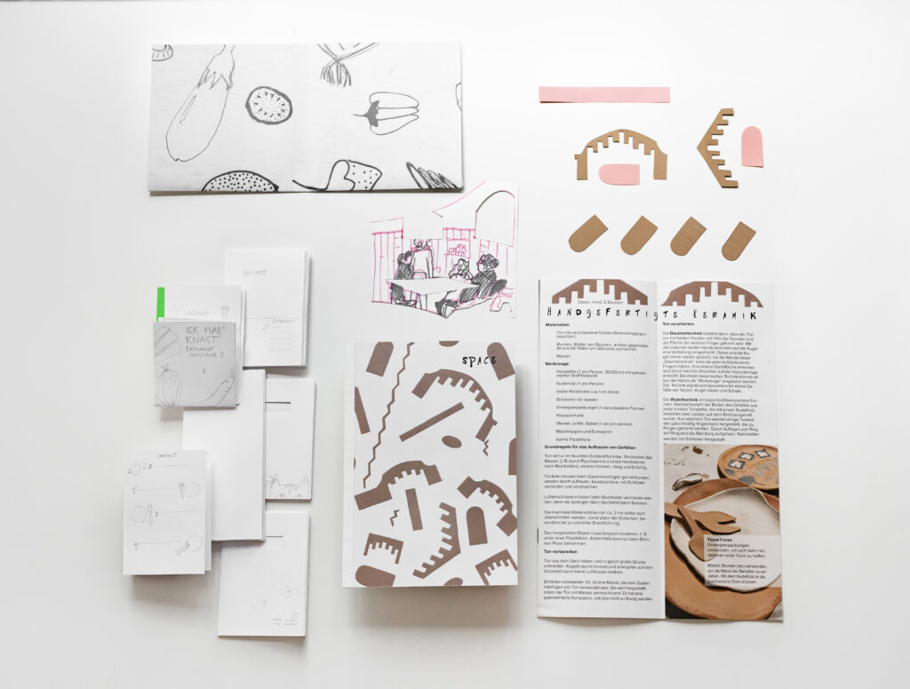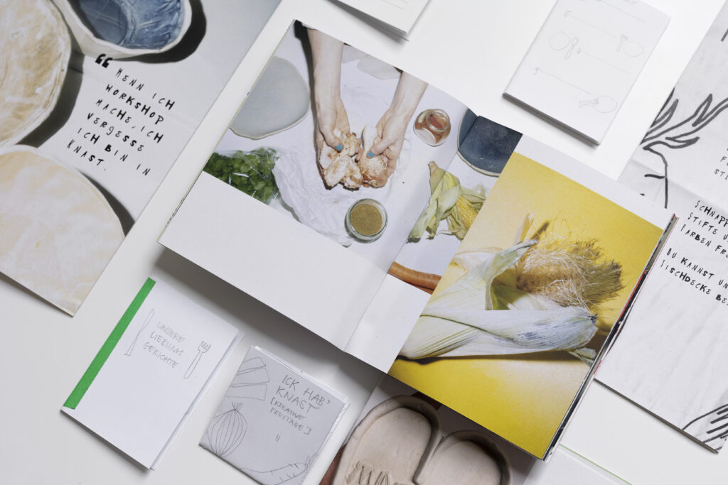 Original plan of the singular book of recipes changed, as project team came to the conclusion it was no longer sufficient to hold space for the recipes and stories that were shared during the process. A singular book became a bundle of 5 print-pieces: Introduction Leaflet, Recipes Book, Workshops Leaflet, Space Book and a Newspaper. In this way each part of the story could be represented in it’s own space by keeping the recipes as a connection bridge between creators and readers, while giving the insight into the project process (Introduction) and what one needs to start such project (Workshops), space that shaped (Space) it and critical analysis of it (Newspaper). Recipe book turned into the project that aimed to “Strengthen self-confidence and empathy for others through creativity”.