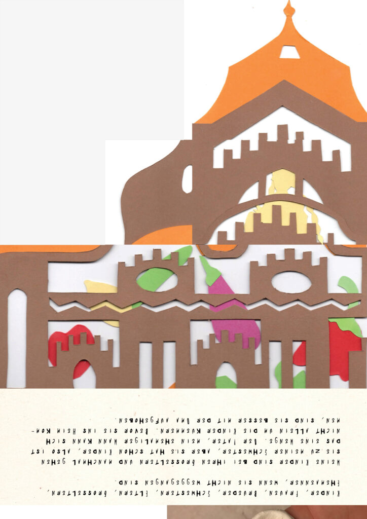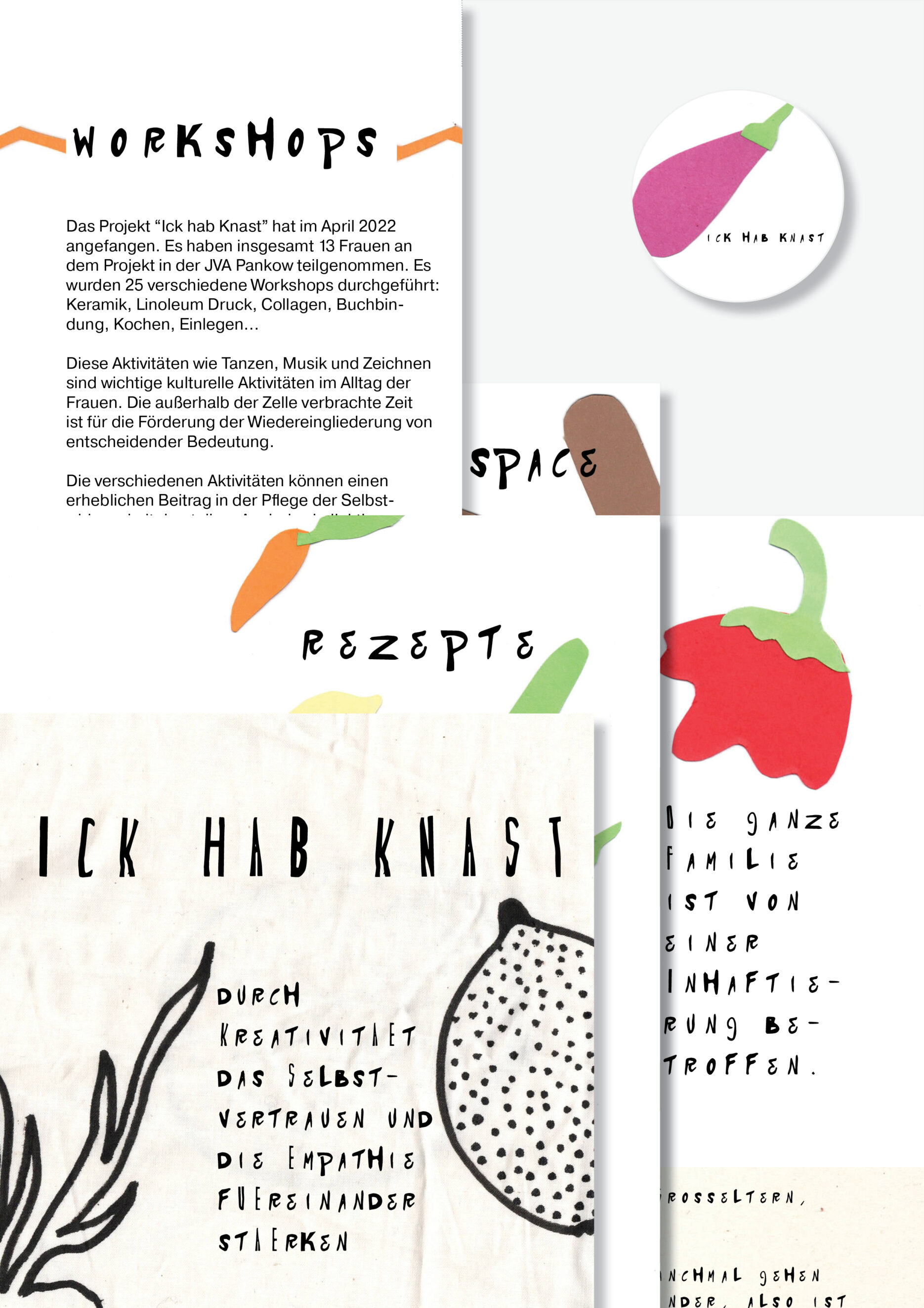 “Ick hab Knast” was originally conceived as a recipe book. Favorite recipes from childhood and adulthood times shared by the women for wider public. Group of women and the project team were meeting on creative Fridays (Kreative Freitagen) at the JVA* für Frauen in Berlin-Pankow with the aim to exchange recipes and together create the book. Paper collages and stop-motion animations facilitated the process of communication in the multilingual team with diverse backgrounds.